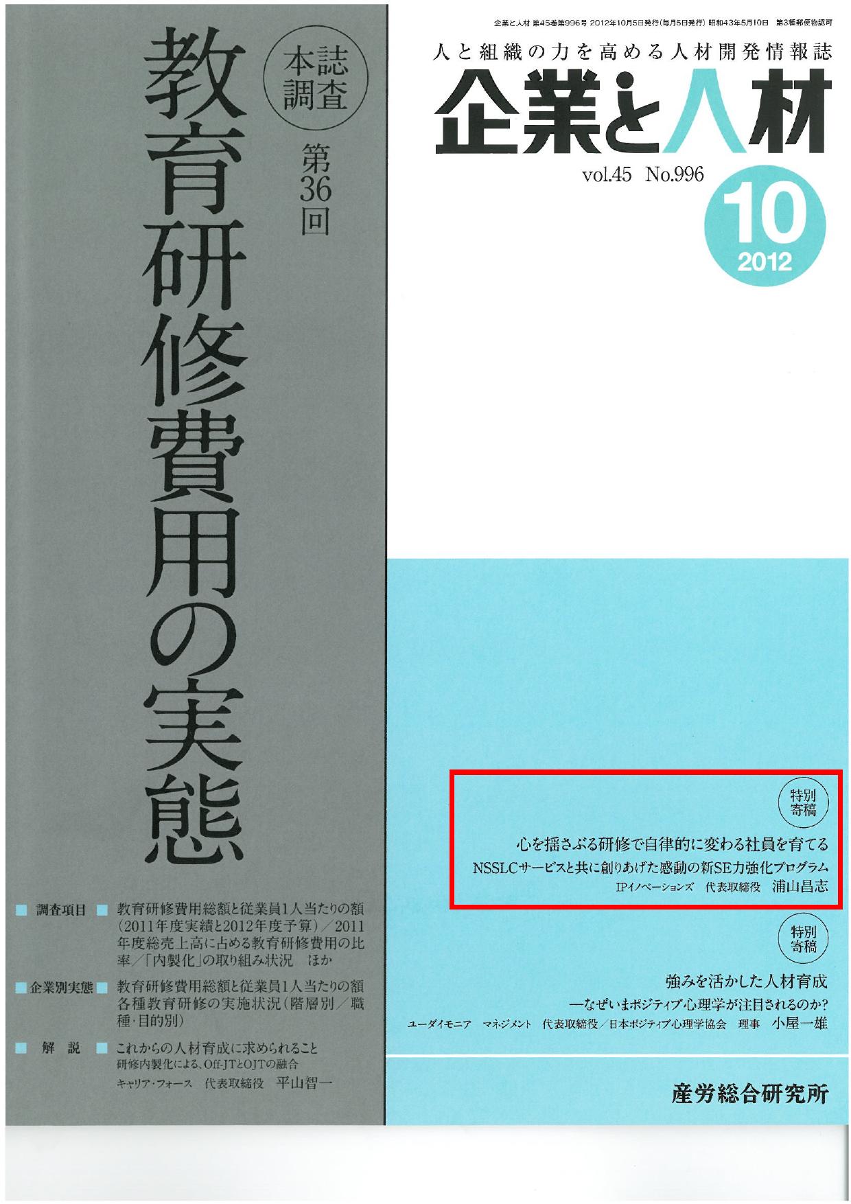 【企業と人材】2012年10月号 特別寄稿「心を揺さぶる研修で自律的に変わる社員を育てる ~NSSLCサービスと共に創りあげた感動の新SE力強化プログラム~」